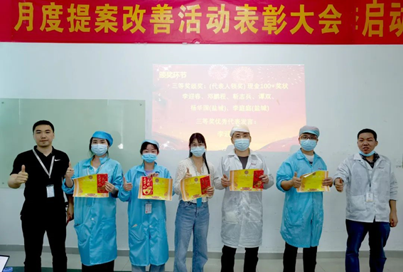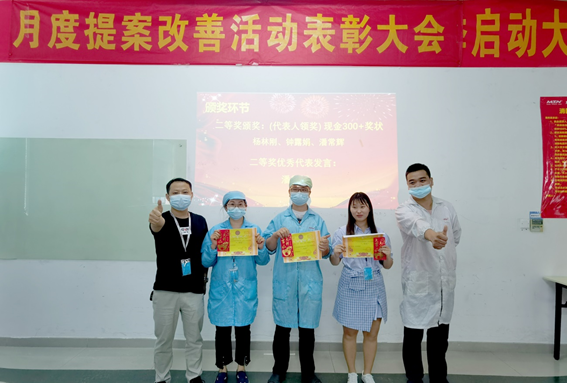 2月份,共收到員工提出141項(xiàng)提案,經(jīng)各評(píng)審小組審核評(píng)選,最終角逐出一等獎(jiǎng)1名,二等獎(jiǎng)3名,三等獎(jiǎng)6名,評(píng)審小組成員分別為優(yōu)秀提案改善項(xiàng)目人員頒發(fā)榮譽(yù)證書(shū)、獎(jiǎng)金,并合影留念。