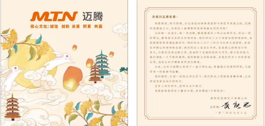 明月寄相思,中秋共團圓。在這個充滿溫情與詩意的傳統(tǒng)佳節(jié)——中秋節(jié)來臨之際,邁騰電子及各子分公司為全體員工精心準(zhǔn)備了中秋節(jié)福利,向每一位辛勤付出的員工及其家人送上最誠摯的祝福和問候。
